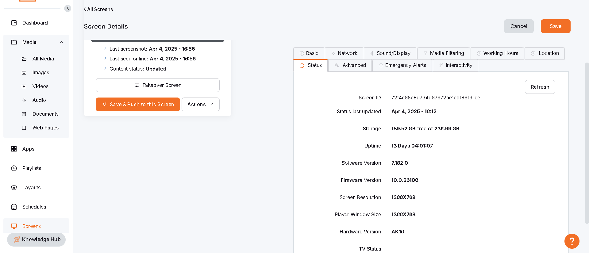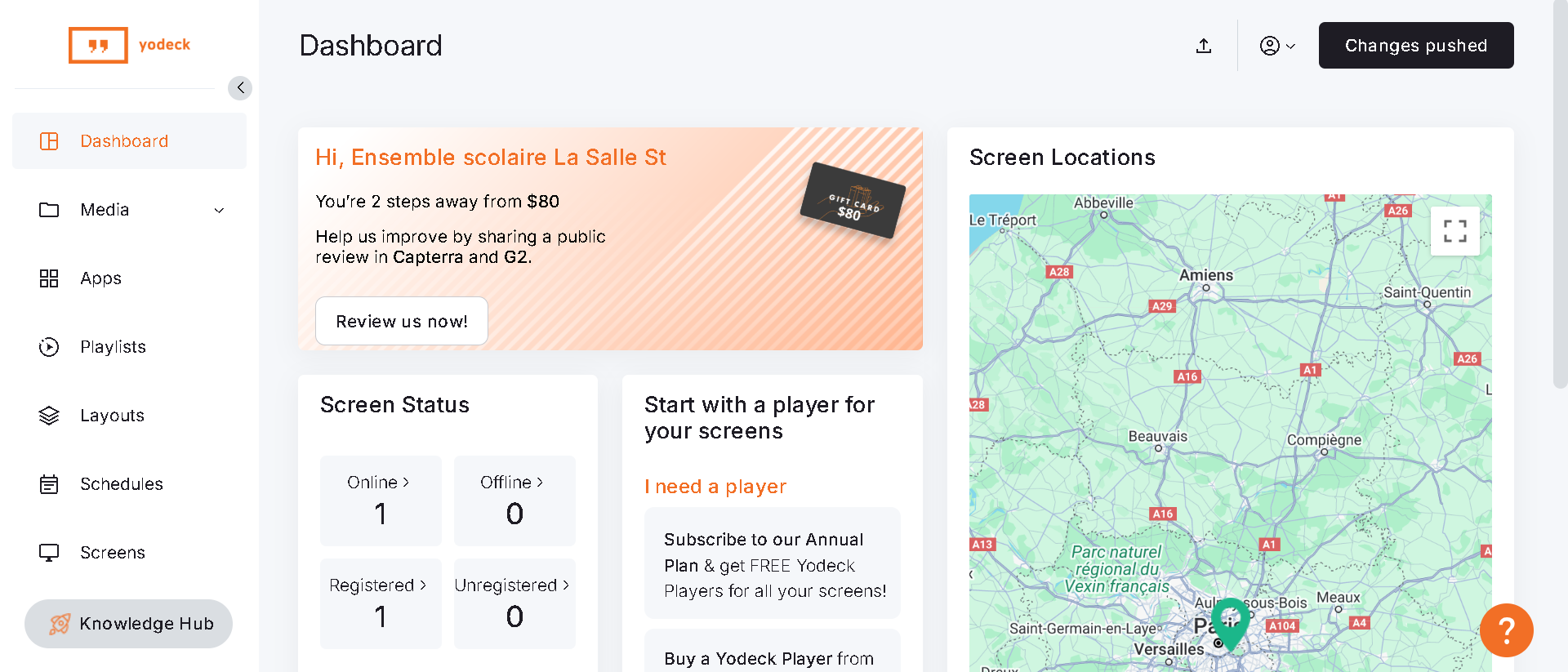 Cette session ne donne accès à rien. Au début, elle n’affiche qu’un écran noir avec un code. Après avoir créé un compte et s’être authentifié, on rentre ce code sur le site de Yodeck, cela nous donne enfin accès au tableau de bord de l’écran. Sur celui-ci, on peut gérer :