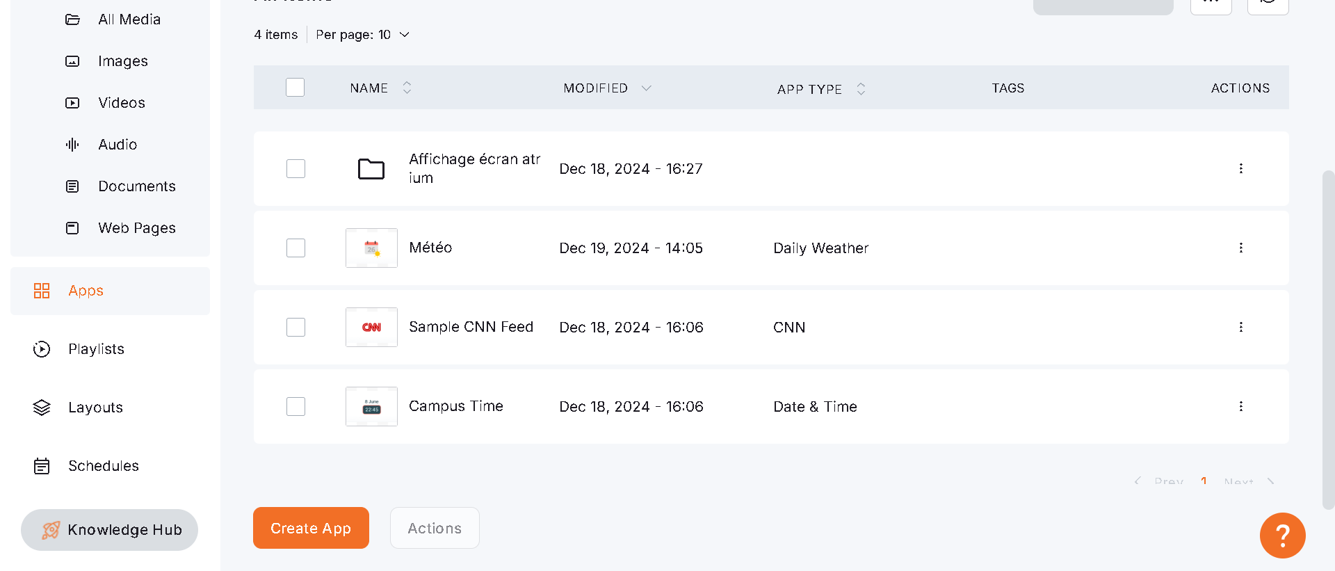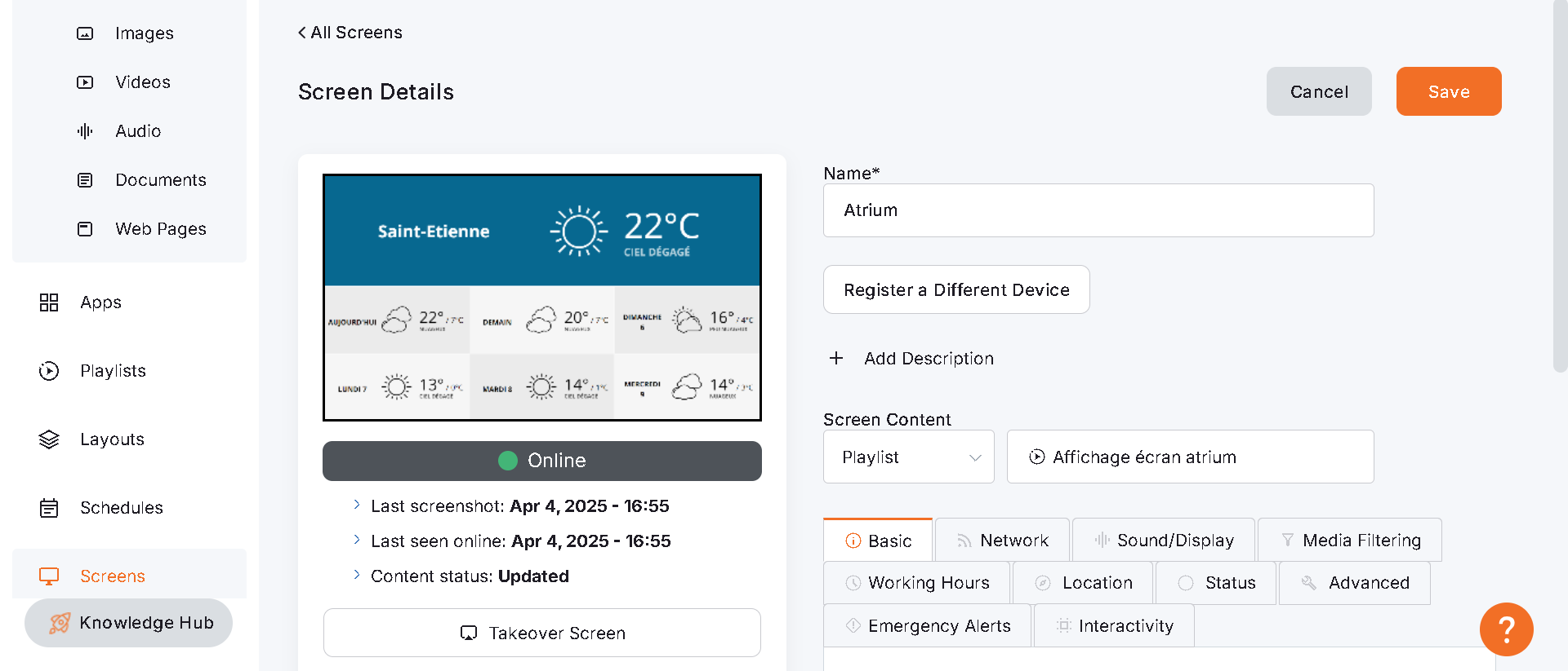 - Le contenu affiché, grâce à des systèmes de playlist et d’événements programmés