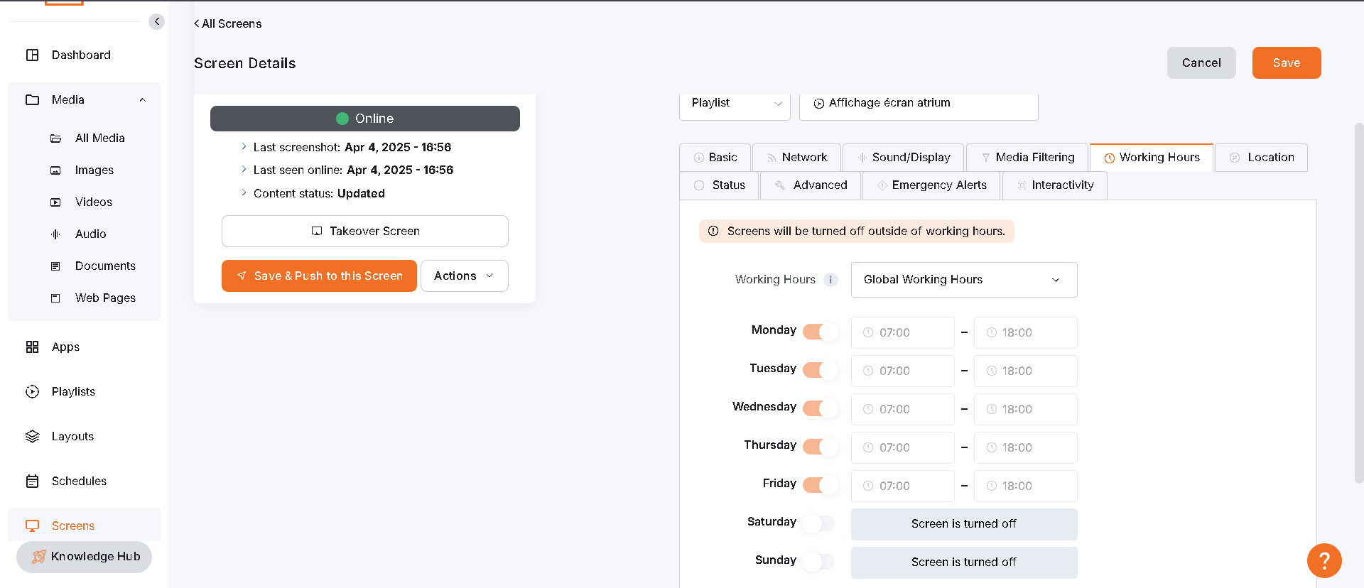 Possibilités de planifier quand et où les contenus doivent être diffusés : par heure, par jour, par écran, ou selon des événements spécifiques. - Diffusion via un player :